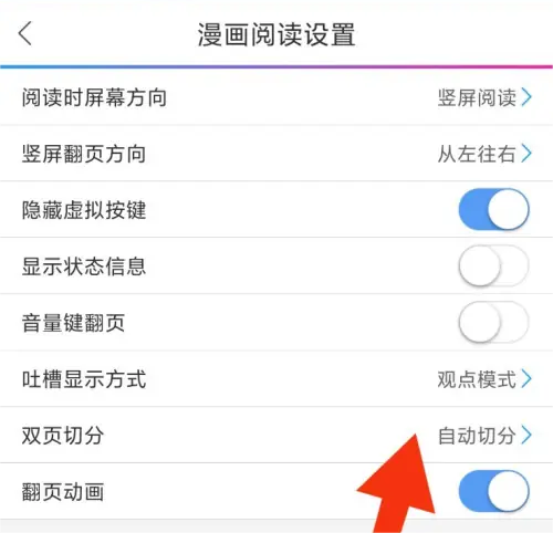 3、在閱讀設置中點擊雙頁切分,選擇自動切分即可。